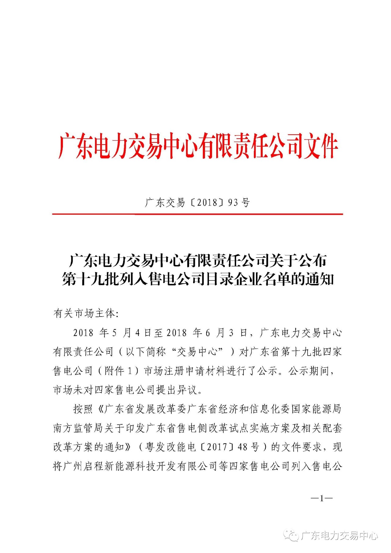 2018年5月4日至6月3日,廣東電力交易中心對廣東省第十九批四家售電公司市場注冊申請材料進(jìn)行了公示。公示期間,市場未對四家售電公司提出異