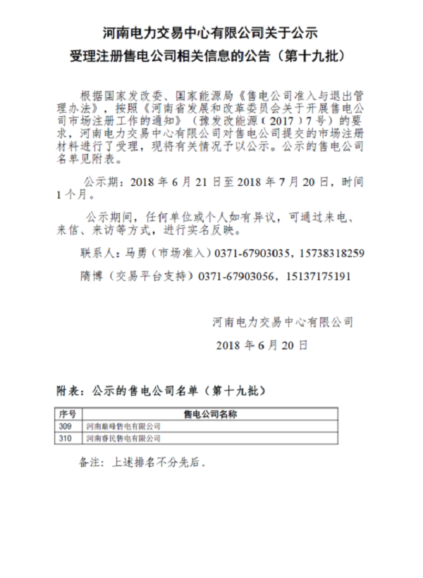河南電力交易中心日前發(fā)布了《河南電力交易中心有限公司關(guān)于公示受理注冊(cè)售電公司相關(guān)信息的公告(第十九批)》,公示河南巔峰售電有限公司在內(nèi)的2家售電公司,公示期為2018年6月21日至2018年7月20日,時(shí)間1個(gè)月。詳情如下: