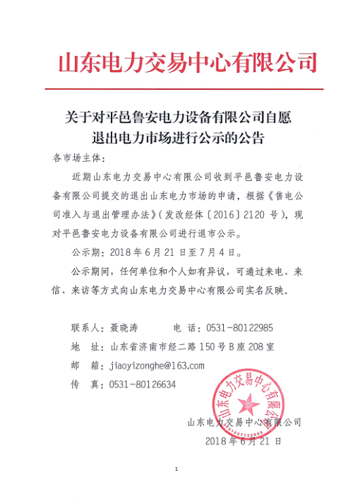 山東電力交易中心日前發(fā)布了《關(guān)于對平邑魯安電力設(shè)備有限公司自愿退出電力市場進行公示的公告》,繼山東世紀(jì)航凱售電有限公司自愿退出電力市場后,又見山東售電公司退市。公示期為2018年6月21日至7月4日。