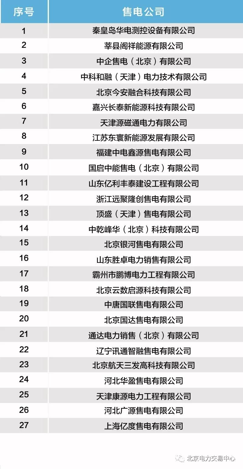 7月4日,北京電力交易中心發(fā)布了售電公司公示結(jié)果公告。按照國家發(fā)改委、國家能源局《售電公司準(zhǔn)入與退出管理辦法》有關(guān)規(guī)定,秦皇島華電測控設(shè)備有限公司等27家售電公司公示無異議,在北京電力交易中心的注冊自動生效。