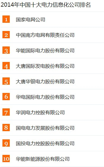 根據(jù)媒體統(tǒng)計(jì)數(shù)據(jù)顯示,2014年中國(guó)十大電力信息化公司排行榜如下: