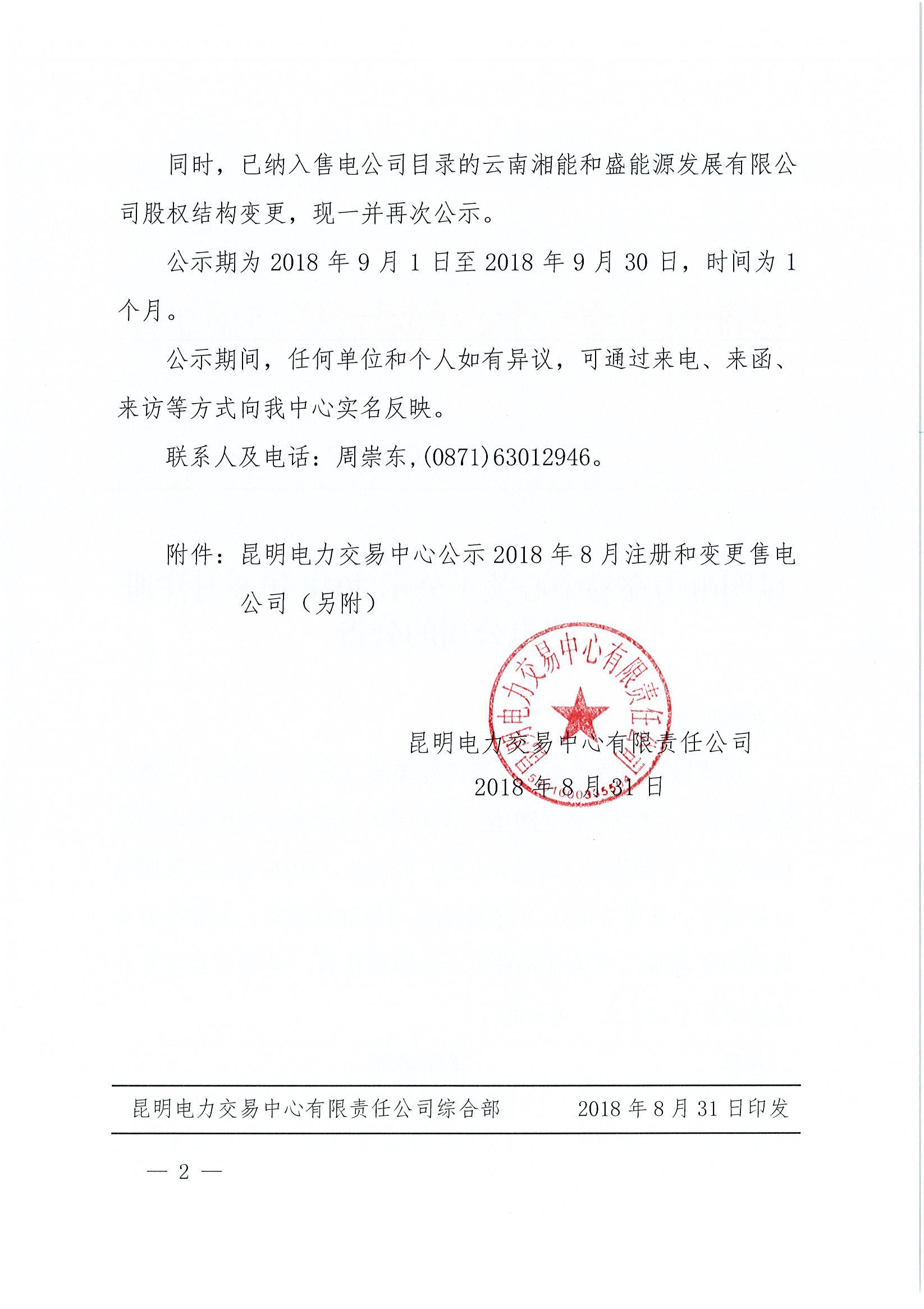 2018年8月昆明電力交易中心受理了下列1家售電公司的注冊中請,對售電公司提交的市場準入申請材料進行了完整性橫驗,現(xiàn)將云南大江電力工程有限公司1家售電公司基本情況子以公示。公示期為208年9月1日至2018年9月30日,時間為1個月。