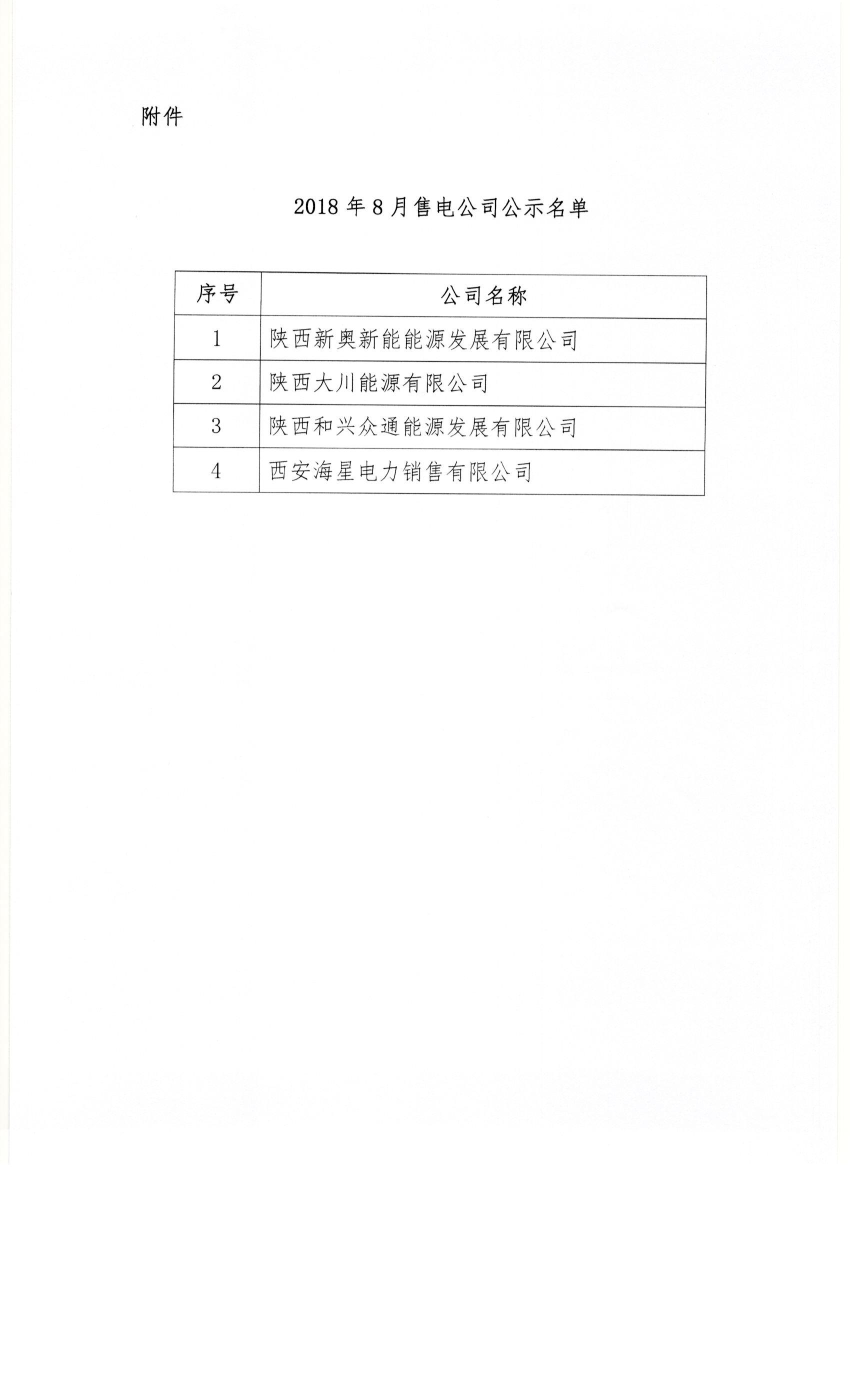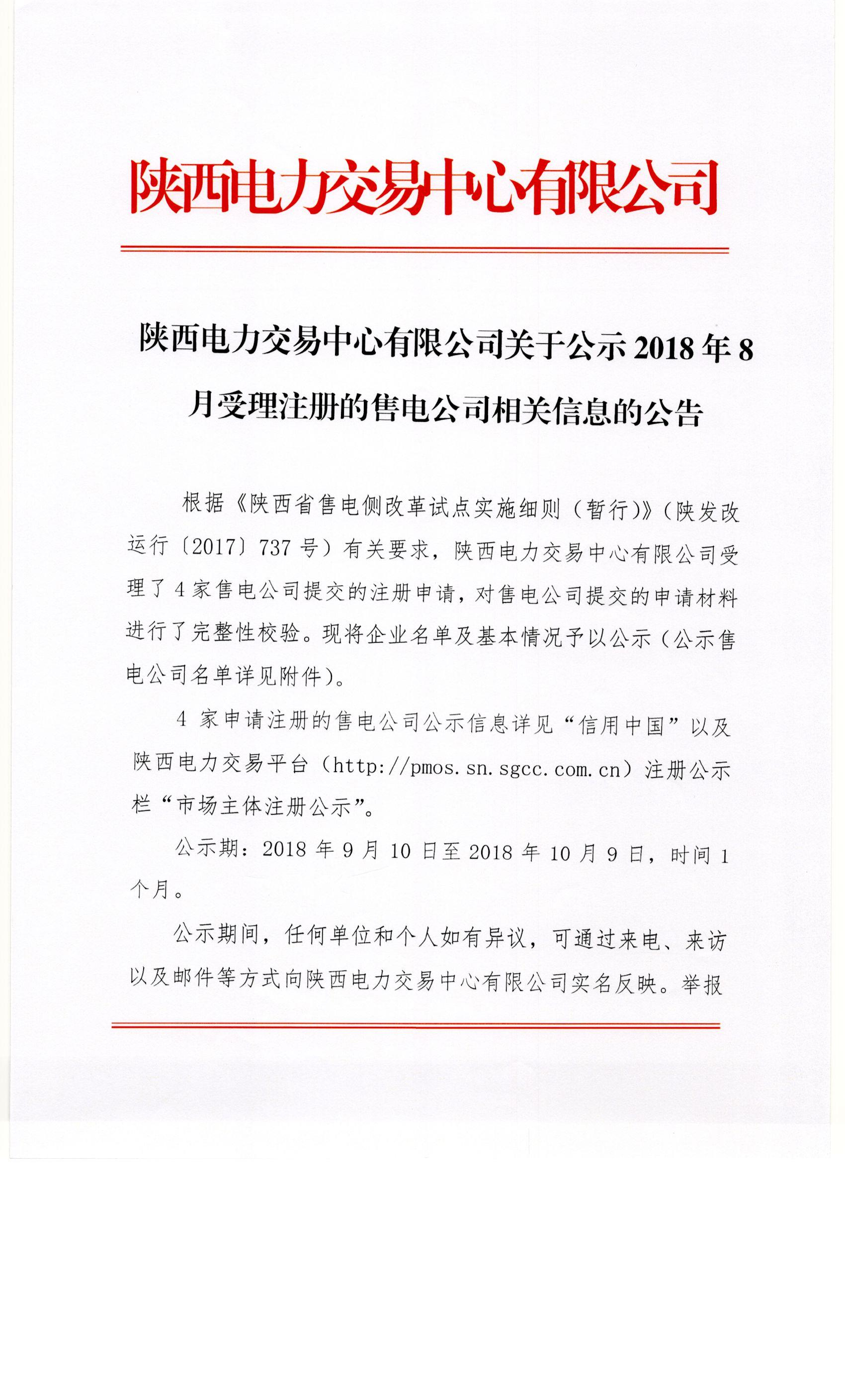 陜西電力交易中心日前發(fā)布了《陜西電力交易中心有限公司關于公示2018年8月受理注冊的售電公司相關信息的公告》,陜西電力交易中心有限公司受理了陜西新奧新能能源發(fā)展有限公司等4家售電公司提交的注冊申請,對售電公司提交的申請材料進行了完整性校驗?,F將企業(yè)名單及基本情況予以公示。公示期:2018年9月10日至2018年10月9日,時間1個月。詳情如下: