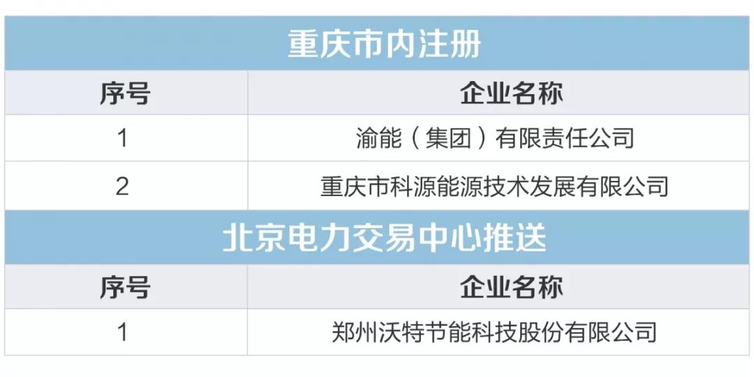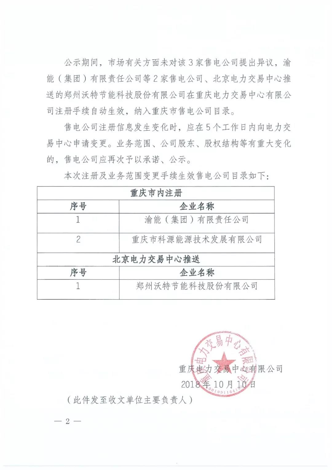 按照國家發(fā)改委、國家能源局《售電公司準入與退出管理辦法》(發(fā)改經(jīng)體〔2016〕2120號)及重慶市政府辦公廳《重慶市售電側(cè)改革試點工作實施方案》(渝府辦發(fā)〔2016〕20號)等文件精神,重慶電力交易中心有限公司于2018年9月10日至10月9日對渝能(集團)有限責(zé)任公司等2家售電公司注冊申請材料以及北京電力交易中心推送的鄭州沃特節(jié)能科技股份有限公司業(yè)務(wù)范圍變更申請材料進行了公示。