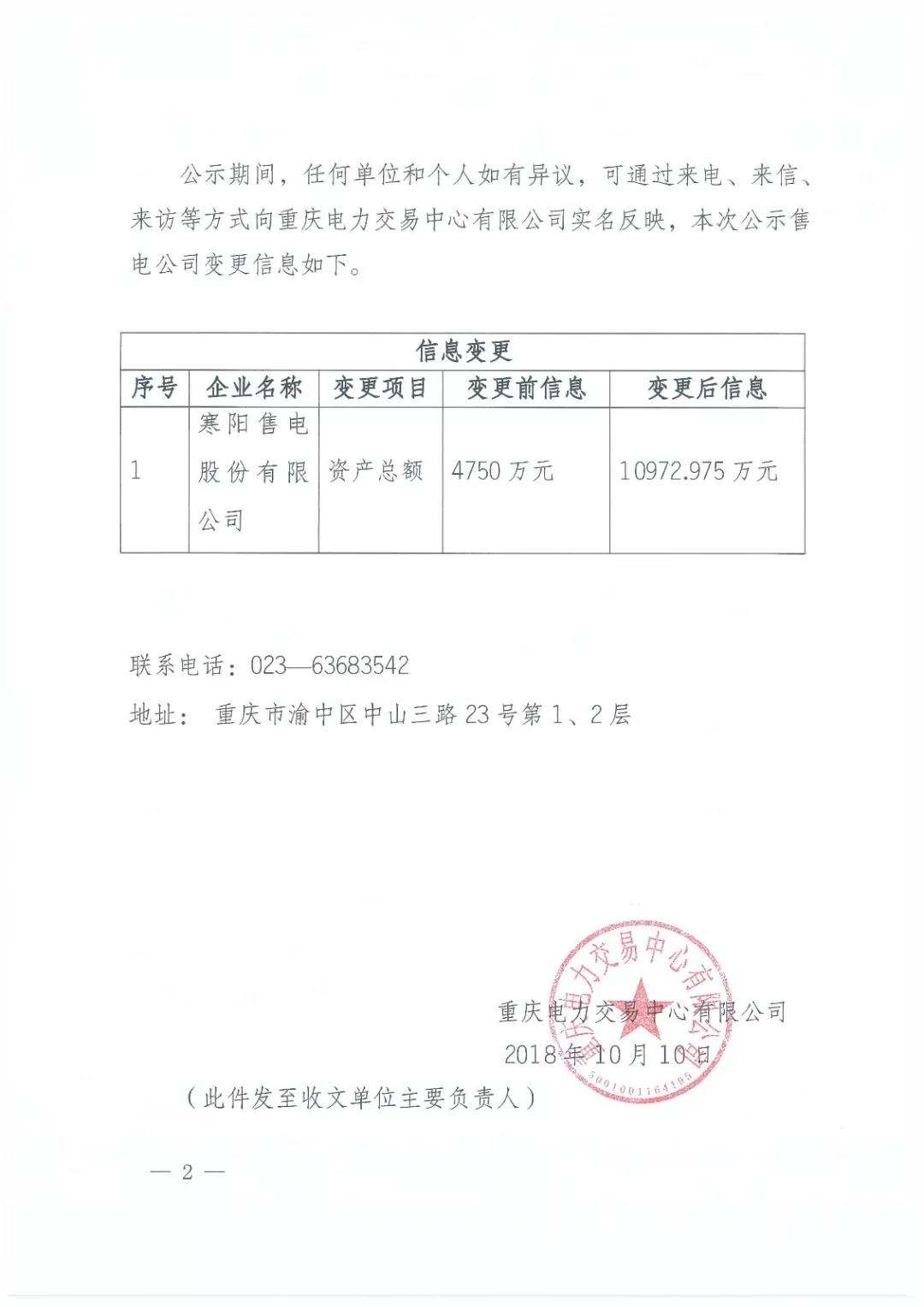 按照國家發(fā)改委、國家能源局《售電公司準(zhǔn)入與退出管理辦法》(發(fā)改經(jīng)體〔2016〕2120號)要求,“業(yè)務(wù)范圍、公司股東、股權(quán)結(jié)構(gòu)等有重大變化的,售電公司應(yīng)再次予以承諾、公示”。重慶電力交易中心有限公司受理了寒陽售電股份有限公司的重大信息變更申請,并對提交的申請材料進(jìn)行了