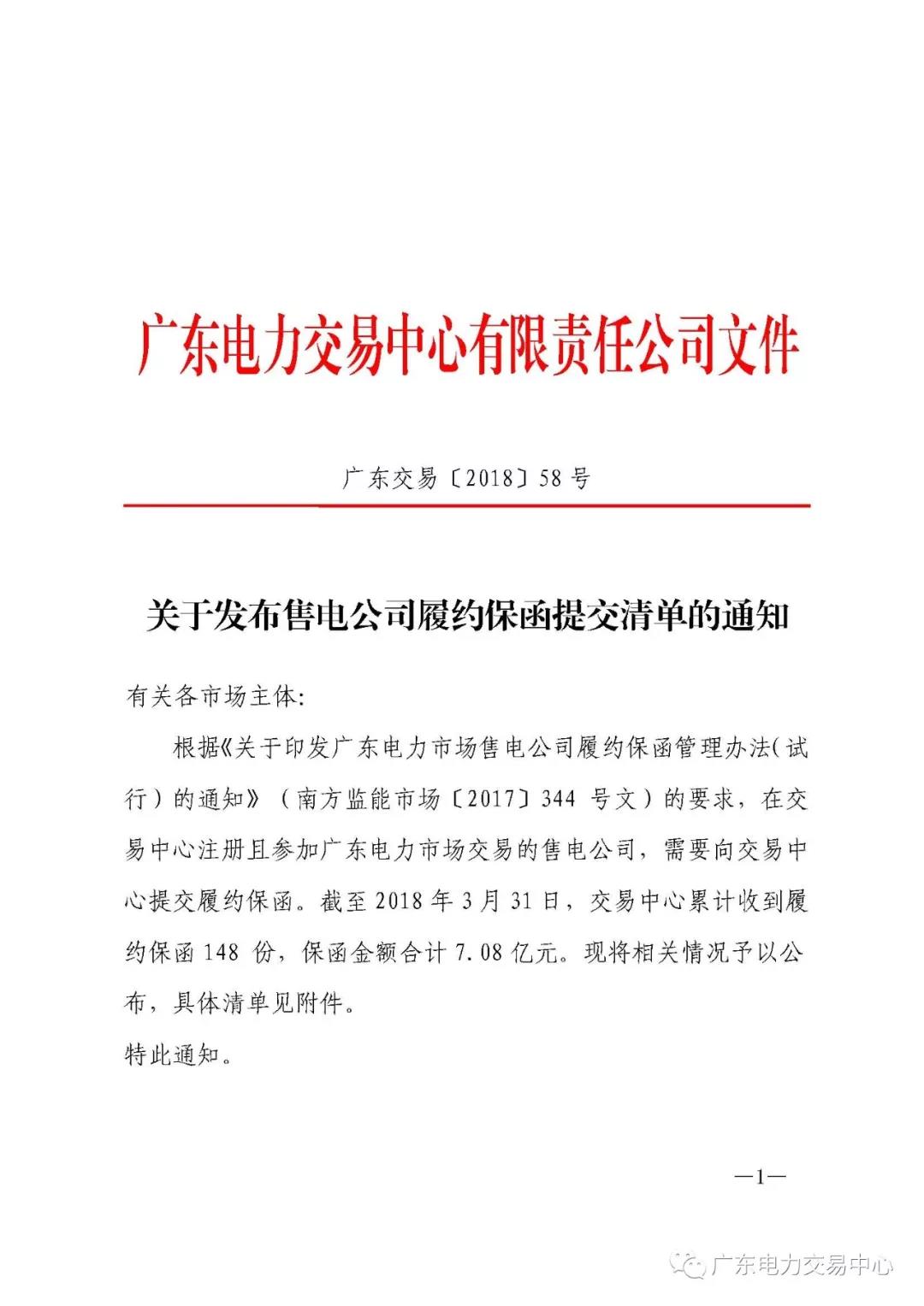 廣東電力交易中心累計收到履約保函148份 保函金額計7.08億元(附詳單)
