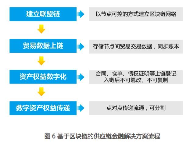 基于區(qū)塊鏈技術,可實現(xiàn)應收賬款、票據(jù)、倉單等資產數(shù)字化,并且留下數(shù)據(jù)存證,降低票據(jù)作假、重復質押等風險,緩解信息不對稱的問題,并基于智能合約屬性使供應鏈金融業(yè)務順利開展。