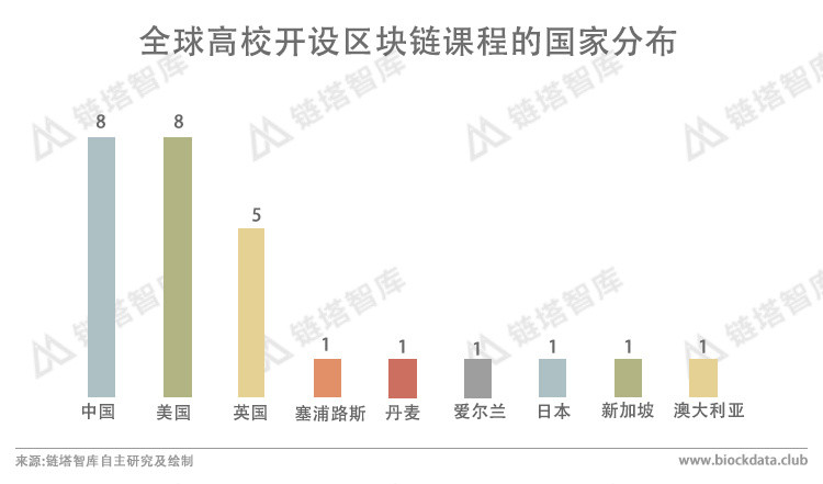 據(jù)“鏈塔智庫”數(shù)據(jù),目前全球27所高校已經(jīng)開設(shè)區(qū)塊鏈課程或相關(guān)培訓(xùn)班。主要分布在中國、美國和英國。其中,中國占8所、美國占8所,英國占5所。