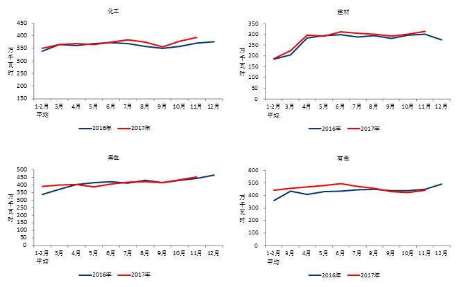 1-11月份,化學(xué)原料制品、非金屬礦物制品、黑色金屬冶煉和有色金屬冶煉四大高載能行業(yè)用電量合計16565億千瓦時,同比增長4.3%,增速比上年同期提高5.2個百分點;合計用電量占全社會用電量的比重為28.9%,對全社會用電量增長的貢獻率為19.7%。其中,化工行業(yè)用電量4057億千瓦時,同比增長4.4%,增速比上年同期提高3.2個百分點;建材行業(yè)用電量3016億千瓦時,同比增長3.6%,增速比上年同期提高1.2個百分點;黑色金屬冶煉行業(yè)用電量4497億千瓦時,同比增長1.4%,增速比上年同期提高6.4個百分點;有色金屬冶煉行業(yè)4994億千瓦時,同比增長7.5%,增速比上年同期提高8.0個百分點。