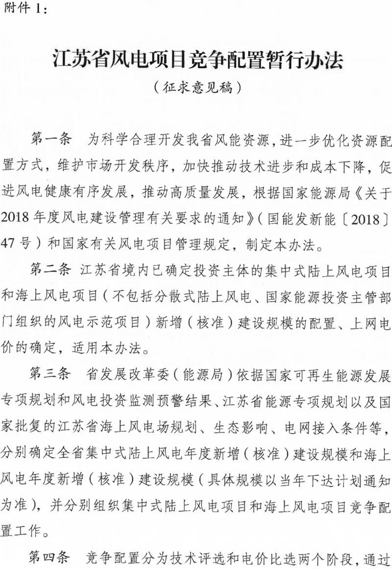 《江蘇省風(fēng)電項目競爭配置暫行辦法》(征求意見稿)、《江蘇省未確定投資主體風(fēng)電項目競爭配置暫行辦法》(征求意見稿)網(wǎng)上意見征集