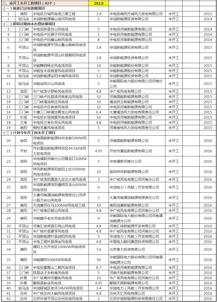 2016年開發(fā)方案項目未按計劃開工的包括洛陽市5個,總規(guī)模27萬千瓦;平頂山市4個,總規(guī)模19.4萬千瓦;南陽市3個,總規(guī)模18.8萬千瓦;濮陽市2個,總規(guī)模57.6萬千瓦;三門峽市2個,總規(guī)模13.7萬千瓦;許昌市2個,總規(guī)模14.95萬千瓦;安陽市1個,規(guī)模5萬千瓦;開封市1個,規(guī)模4.95萬千瓦;駐馬店市1個,規(guī)模3.4萬千瓦;汝州市2個,總規(guī)模9.8萬千瓦(詳見附件2)。
