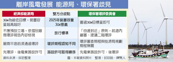 離岸風電環(huán)評陸續(xù)展開,開發(fā)商年底前須通過環(huán)評,隨著個別開發(fā)案環(huán)評進行,經(jīng)濟部、環(huán)保署不同調(diào)情形有加劇趨勢,雙方對于目標裝置容量、環(huán)評放行標準、環(huán)評期程和環(huán)評、電業(yè)籌設(shè)許可取得順序都出現(xiàn)分歧發(fā)展離岸