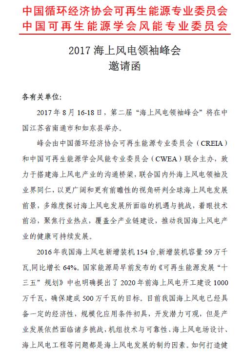2017海上風(fēng)電領(lǐng)袖峰會將于2017年8月16日-18日在江蘇省南通市召開。以下為會議邀請函: