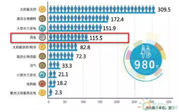 根據(jù)國(guó)際可再生能源署(IRENA)最近發(fā)布的數(shù)據(jù),2016年全球可再生能源行業(yè)的就業(yè)人數(shù)達(dá)到980萬人,風(fēng)能創(chuàng)造就業(yè)崗位較多的兩大技術(shù)分支之一。風(fēng)電從業(yè)者達(dá)到了115萬人。