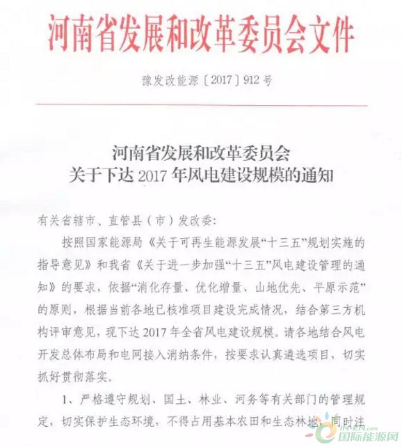 近期,河南省發(fā)改委下發(fā)了《關(guān)于下達(dá)2017年風(fēng)電建設(shè)規(guī)模的通知》。通知顯示,河南省2017年風(fēng)電建設(shè)規(guī)模指標(biāo)共計(jì)411萬(wàn)千瓦,其中山地風(fēng)電181萬(wàn)千瓦,平原風(fēng)電230萬(wàn)千瓦。以下為原文件: