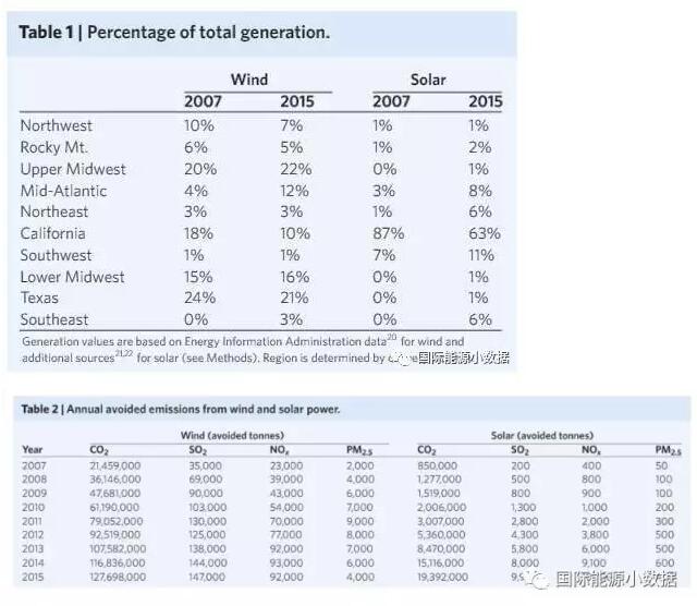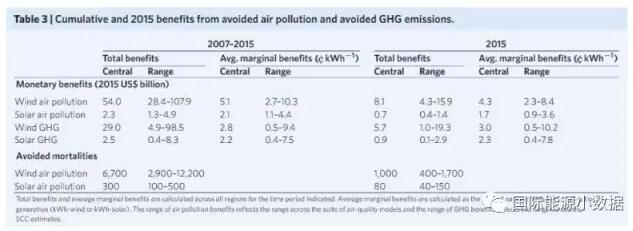 在光伏、風(fēng)電的發(fā)展過(guò)程中,大多數(shù)人都在關(guān)注其成本的下降,特別是何時(shí)實(shí)現(xiàn)平價(jià)上網(wǎng),但是對(duì)于光伏、風(fēng)電的公共效益往往只是定性描述。針對(duì)這個(gè)問題,美國(guó)勞倫斯伯克利國(guó)家實(shí)驗(yàn)室研究人員在最新一期《自然˙能源》發(fā)表文章,對(duì)因?yàn)轱L(fēng)電、光伏帶來(lái)的空氣改善所帶來(lái)的公共收益進(jìn)行了量化計(jì)算,具體計(jì)算過(guò)程和結(jié)果可參見以下三個(gè)表格(美國(guó)各地區(qū)光伏風(fēng)電比例、污染物減排數(shù)字、因減排帶來(lái)的經(jīng)濟(jì)收益)。