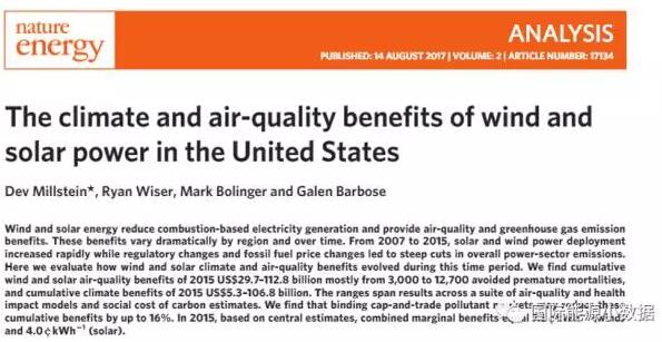 在光伏、風(fēng)電的發(fā)展過(guò)程中,大多數(shù)人都在關(guān)注其成本的下降,特別是何時(shí)實(shí)現(xiàn)平價(jià)上網(wǎng),但是對(duì)于光伏、風(fēng)電的公共效益往往只是定性描述。針對(duì)這個(gè)問題,美國(guó)勞倫斯伯克利國(guó)家實(shí)驗(yàn)室研究人員在最新一期《自然˙能源