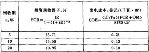 上一段文字我們分析了風(fēng)能發(fā)電的優(yōu)缺點(diǎn),那么接下來(lái)以水平軸中風(fēng)力發(fā)電機(jī)來(lái)進(jìn)行風(fēng)能發(fā)電成本計(jì)算。水平軸中型風(fēng)力發(fā)電機(jī)組額定容量PR=200千瓦,設(shè)備及工程總投資費(fèi)用IC = 30萬(wàn)美元,年運(yùn)行及維修費(fèi)用率OM=2%。要求的年回收率IR=9%(其中包括1%的保險(xiǎn)費(fèi)用)。風(fēng)力發(fā)電機(jī)安裝在年平均風(fēng)速為6米/秒的地區(qū)內(nèi),容量系數(shù)CF=23%。則投資回收期分別為5年、10年及20年的發(fā)電成本計(jì)算如下: