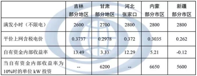 由上表測算可以看出,2018年電價調整后,部分風電場已經很難滿足自有資金內部收益10%的要求,近幾年內更無法滿足平價上網條件。若要實現平價上網,以下對一些投資少、資源好的地區(qū)在不限電情況下進行平價上網分析,包括吉林、甘肅、張家口、內蒙、新疆。