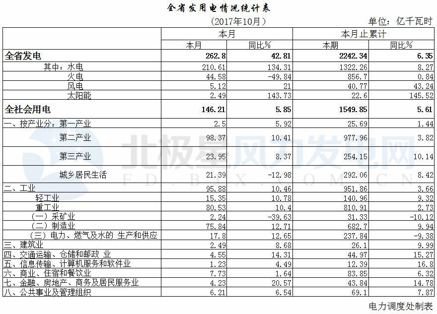 十月份,全省全社會用電穩(wěn)步增長,工業(yè)用電快速增長。全省電力系統(tǒng)認真貫徹落實省委、省政府關(guān)于十九大期間保電工作部署,強化和落實各項保電措施,確保了全省電網(wǎng)安全穩(wěn)定運行和電力正常供應(yīng),圓滿完成了十九大保電任務(wù)。當月,全省發(fā)電262.80億千瓦時,增長42.81%;全社會用電146.21億千瓦時,增長5.85%,其中工業(yè)用電95.88億千瓦時,增長10.46%。