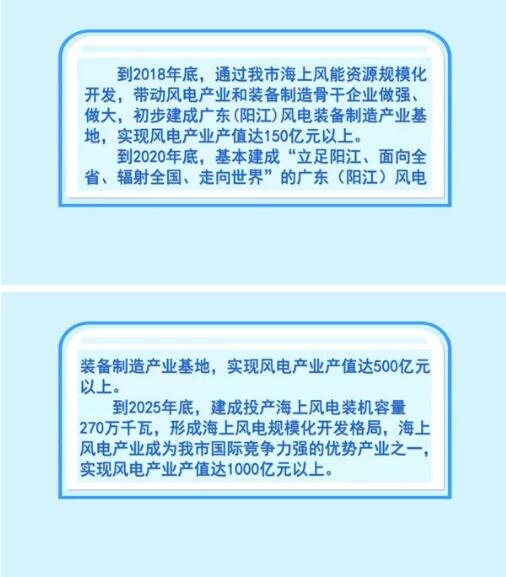 到2018年底,通過(guò)我市海上風(fēng)能資源規(guī)模化開(kāi)發(fā),帶動(dòng)風(fēng)電產(chǎn)業(yè)和裝備制造骨干企業(yè)做強(qiáng)、做大,初步建成廣東(陽(yáng)江)風(fēng)電裝備制造產(chǎn)業(yè)基地,實(shí)現(xiàn)風(fēng)電產(chǎn)業(yè)產(chǎn)值達(dá)150億元以上。