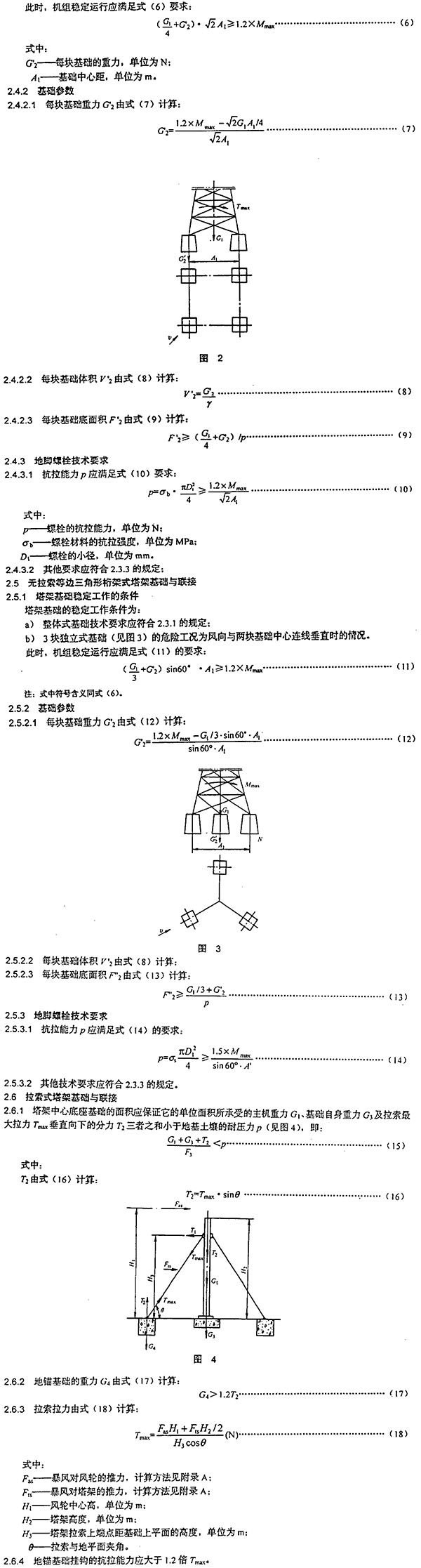 2.2.3拉索式塔架的地錨基礎(chǔ)應(yīng)具有足夠的穩(wěn)定性,以免在暴風(fēng)工況下發(fā)生整機(jī)傾倒事故。