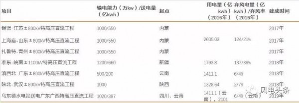 在建的中西部特高壓項目、所在省份及2017年上半年棄風(fēng)情況