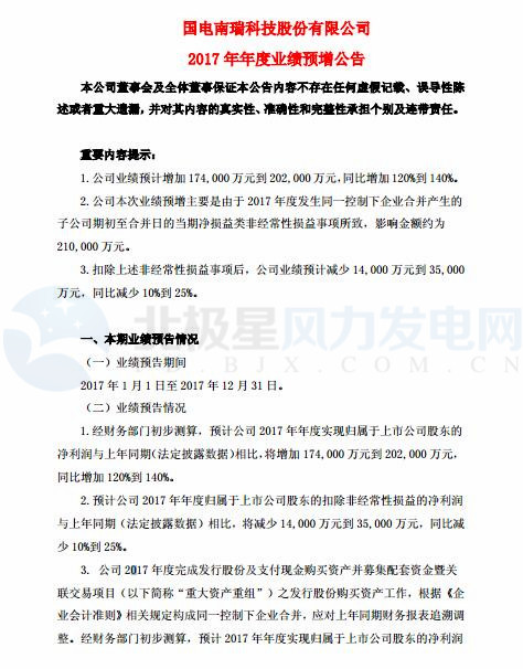 國電南瑞2017年預(yù)計實現(xiàn)歸屬于上市公司股東的凈利潤比去年同期增加 174,000 萬元到 202,000 萬元,同比增加 120%到 140%。