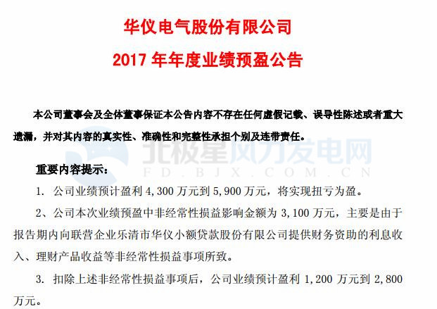 受風(fēng)電主營業(yè)務(wù)影響 華儀電氣預(yù)計2017年凈利潤4,300萬元-5,900 萬元