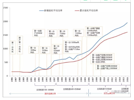 30多年來,風(fēng)電機(jī)組單機(jī)功率增加了100多倍,最大風(fēng)電機(jī)組達(dá)到6MW以上。截止到2016年,我國新增裝機(jī)的風(fēng)電機(jī)組平均功率達(dá)到1955kW,累計(jì)裝機(jī)的風(fēng)電機(jī)組平均功率為1608kW,風(fēng)電主流機(jī)型為2000kW,占比到60%以上。