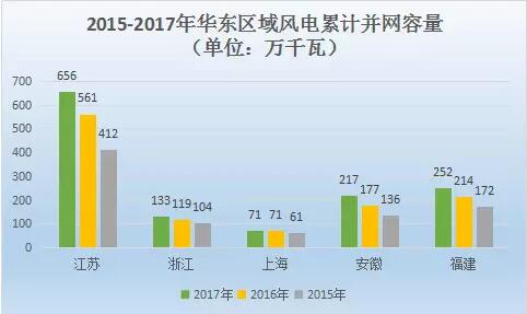 華東區(qū)域沿海風電資源豐富,以江蘇、福建兩省份最為突出,2017年江蘇和福建風電并網容量分別為656萬千瓦、252萬千瓦,同比增長16.9%、17.8%。
