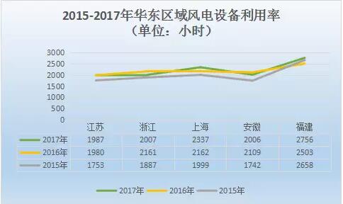 從風電設備利用率來看,2017年江蘇、浙江、上海、安徽、福建風電設備利用小時數(shù)分別為1987小時、2007小時、2337小時、2006小時、2756小時,其中江蘇、上海、福建同比增長0.4%、8.1%、10.1%。