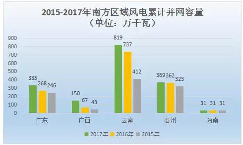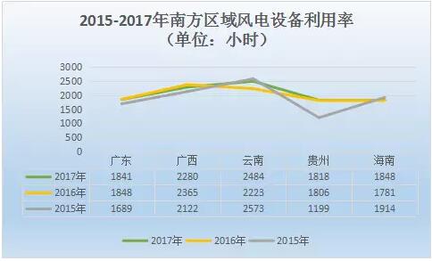 從風電設備利用率來看,2017年廣東、廣西、云南、貴州、海南風電利用小時數(shù)分別為1841小時、2280小時、2484小時、1818小時、1848小時,除廣西地區(qū)風電設備利用率有小幅下降外,其他地區(qū)依然呈緩慢提升。