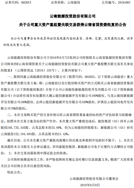 6月8日,云南能投發(fā)布公告稱,云南省國資委原則同意云南能投以發(fā)行股份購買資產的方式購買大姚云能投新能源開發(fā)有限公司100%股權、馬龍云能投新能源開發(fā)有限公司100%股權、會澤云能投新能源開發(fā)有限公司100%股權、瀘西縣云能投風電開發(fā)有限公司70%的股權。公告原文如下: