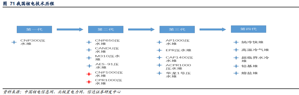 現(xiàn)狀:三代核技術(shù)迎來新突破,核電審批速度有望加快我國核電技術(shù)可以分成 4 級(jí),第一級(jí)為原型堆機(jī)組、第二級(jí)為壓水堆、沸水堆、重水堆等機(jī)組、第三級(jí)為歐洲壓水堆和先進(jìn)非動(dòng)能壓水堆等機(jī)組,第四級(jí)為高溫氣冷堆機(jī)組。目前我國投運(yùn)的核電機(jī)組都是二代和二代改進(jìn)的反應(yīng)堆,在建和擬核準(zhǔn)的核電站機(jī)組主要為三代反應(yīng)堆。目前我國主要的三代核反應(yīng)堆型號(hào)有華龍 1 號(hào)、AP1000、CAP1400、EPR、ACPR1000。