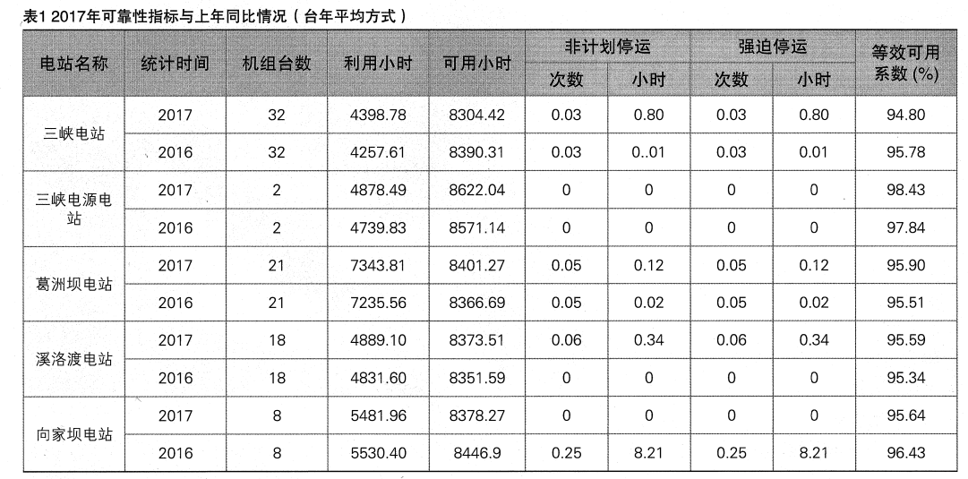 長江電力通過合理安排電站運行方式,加強對設(shè)備運行期間的運行監(jiān)測、診斷分析,及時發(fā)現(xiàn)處理設(shè)備缺陷及隱患,保證機組安全穩(wěn)定運行。針對電力生產(chǎn)過程中暴露出的典型缺陷和重點問題,公司高度重視,及時提出應(yīng)對措施,提出技術(shù)改造方案并組織實施。因運行調(diào)度合理、設(shè)備運行維護良好,各電站的可靠性指標保持較高水平,主要指標(臺年平均方式)見表1。