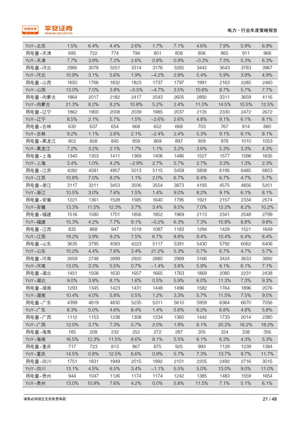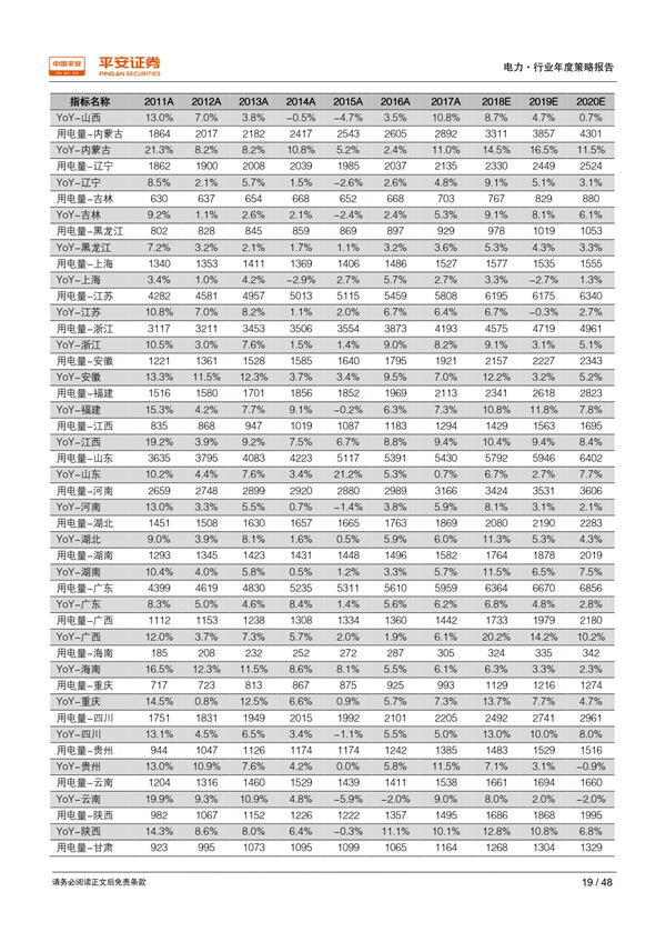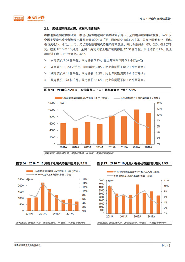 回顧 2018:用電需求超出預期,利用小時止跌回升。 宏觀經(jīng)濟總體持穩(wěn)為全社會用電量增長提供了有力支撐,疊加年初寒潮和夏季“高溫時間長、范圍廣、強度強”的氣候特征, 1-10 月全社會用電量同比增長 8.7%,比上年同期提高 2.1 個百分點,大幅高于年初預期。超預期的用電需求增長推動發(fā)電量達到 2012 年以來的最高增速 7.2%;規(guī)模以上電廠裝機容量同比增長 5.2%,比上年同期下降 2.1 個百分點;利用小時同比增加 100 小時,自 2012 年以來首次正增長, 驗證了我們對供需拐點到來的判斷。