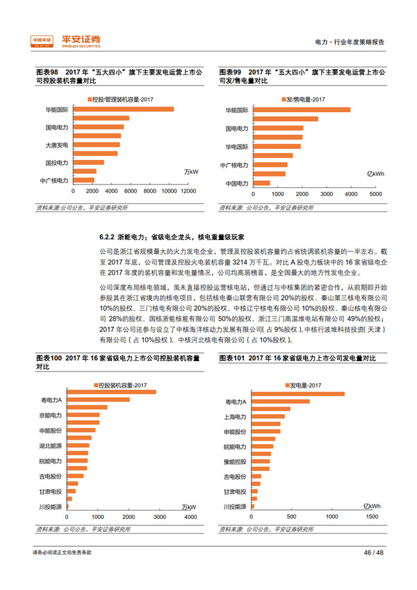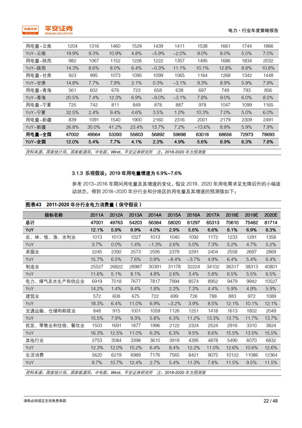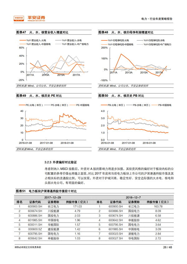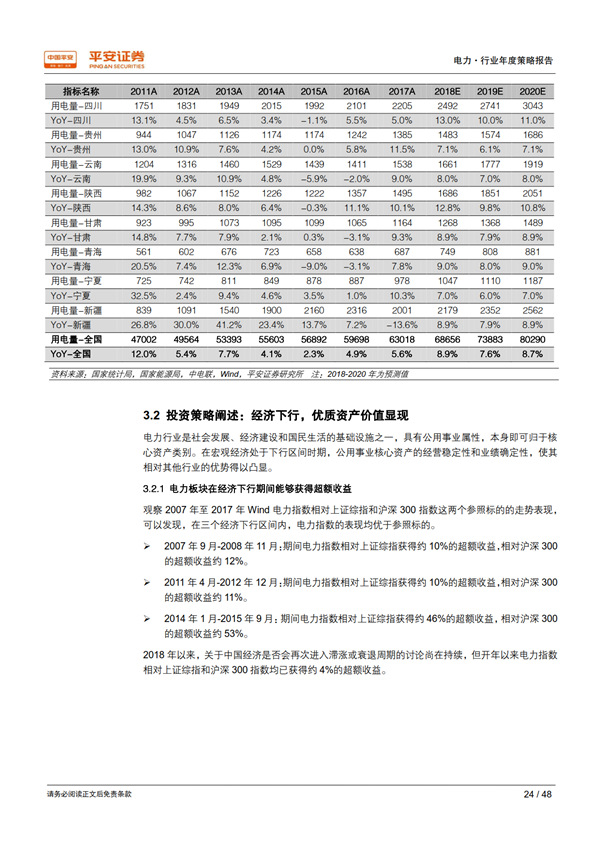 展望 2019:需求大概率回落,優(yōu)質(zhì)資產(chǎn)價值凸顯: 我們從行業(yè)和地區(qū)兩個維度,采用保守、中性、樂觀三種假設情境,對 2018-2020 年的用電量及其增速進行測算,保守情境下 2019 年用電量增速為 4.1%-5.1%、中性為 6.0%-6.3%、樂觀為 6.9%-7.6%。 當宏觀經(jīng)濟處于下行時期,公用事業(yè)核心資產(chǎn)經(jīng)營穩(wěn)定性和業(yè)績確定性的優(yōu)勢將得以凸顯。 最近十年中的三個經(jīng)濟下行期內(nèi),電力板塊的表現(xiàn)均優(yōu)于上證綜指和滬深 300 指數(shù);2018開年以來電力指數(shù)相對上證綜指和滬深 300指數(shù)均已獲得約 4%的超額收益。 我們通過護城河、 穩(wěn)定性、成長潛力、安全邊際 4 個標準,甄選出板塊內(nèi)的優(yōu)質(zhì)資產(chǎn)——核電與大型水電運營商。
