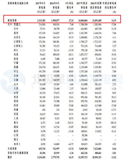 截至2017年9月30日,龍源電力2017年累計完成發(fā)電量325.96億千瓦時(32,595,723兆瓦時),同比增加12.42%。其中,風(fēng)電累計發(fā)電量240.84億千瓦時(24,084,004兆瓦時),同比增加14.19%,其他可再生能源發(fā)電量減少3.81%。