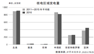 《報(bào)告》統(tǒng)計(jì)顯示,去年,亞洲地區(qū)的核電發(fā)電量占到全球核電發(fā)電總量的18%。從具體地區(qū)來(lái)看,中國(guó)大陸地區(qū)是去年亞洲核電發(fā)電最多的地區(qū),總裝機(jī)容量為3.3657萬(wàn)兆瓦的37座核反應(yīng)堆,去年總共發(fā)電210.5太瓦時(shí)。其次是韓國(guó),擁有24個(gè)核反應(yīng)堆,總裝機(jī)容量為2.2505萬(wàn)兆瓦,去年共發(fā)電154.2太瓦時(shí)。印度擁有22座核反應(yīng)堆,總裝機(jī)容量為6219兆瓦,去年總發(fā)電量為35太瓦時(shí)。另有分布在伊朗、巴基斯坦和中國(guó)臺(tái)灣地區(qū)的12座核反應(yīng)堆,去年總共發(fā)電41.5太瓦時(shí)。