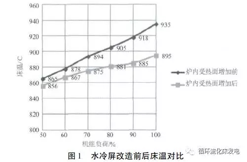 循環(huán)流化床鍋爐爐內(nèi)脫硫反應(yīng)最佳溫度區(qū)間為850~900℃。通過(guò)熱力計(jì)算,確定通過(guò)中隔墻水冷屏,增加爐內(nèi)受熱面換熱,降低爐膛床溫。增加36根與中隔墻水冷屏同材質(zhì)的20G,規(guī)格為76×8的管排,換熱面積約為120m3。經(jīng)70%、80%、90%、100%負(fù)荷工況比對(duì),床溫分別降低18℃、24.5℃、28℃、35℃。改造后50%~100%負(fù)荷工況時(shí)爐膛床溫維持在855~895℃區(qū)間,始終處于脫硫最佳反應(yīng)溫度(如圖1)。增加中隔墻水冷屏后,中隔墻兩側(cè)屏式過(guò)熱器壁溫超溫現(xiàn)象徹底解決,減溫水量由5t/h降至1t/h,進(jìn)一步證明水冷屏增加后對(duì)床溫的影響。同時(shí),對(duì)再熱器出口蒸汽溫度無(wú)明顯影響,兩側(cè)再熱汽溫均能達(dá)到額定值。