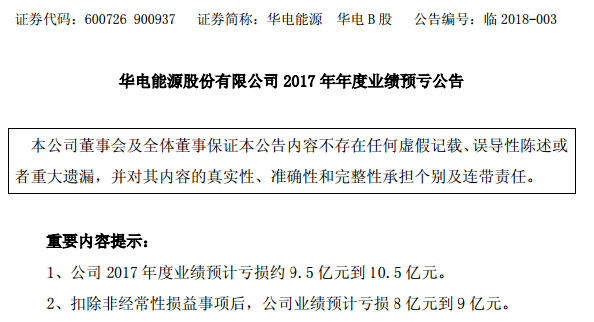 今日,華電能源股份有限?公司發(fā)布2017年年度業(yè)績(jī)預(yù)虧公告,2017年,電力上市公司華電能源業(yè)績(jī)預(yù)計(jì)虧損約9 5億元到10 5億元。公告全文如下
