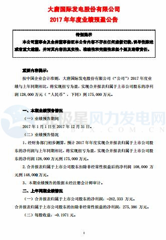 大唐發(fā)電預(yù)計2017凈利潤128,000萬元到175,000萬元 實現(xiàn)扭虧為盈