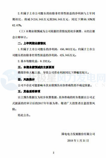 國電電力預計2017年凈利潤同比下降22.69億元到27.69億元