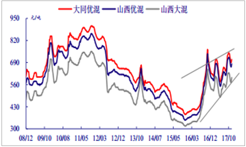 三分之二虧損面。前三季度煤電行業(yè)(包括未上市公司)約有三分之二陷入虧損境地,其中山西的虧損面達(dá)到近90%。煤價(jià)“高燒不退”。眾所周知,煤價(jià)高企是煤電虧損主因。動(dòng)力煤自2016年下半年開(kāi)啟新一輪上漲周期。山西優(yōu)混(5500大卡)16年峰值是谷值的2倍,創(chuàng)歷年來(lái)年內(nèi)漲幅記錄。2017年,發(fā)改委出臺(tái)政策遏制住了煤價(jià)單邊上漲態(tài)勢(shì),但振幅遠(yuǎn)遠(yuǎn)超過(guò)了發(fā)改委認(rèn)為的合理區(qū)間500-570元/噸。我們預(yù)測(cè),12月供暖期需求旺盛,難免推動(dòng)價(jià)格繼續(xù)上漲。