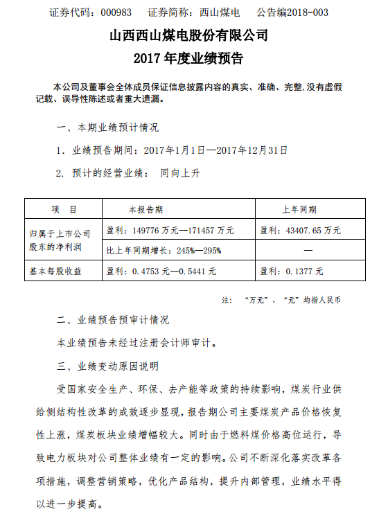 近日,山西焦煤西山煤電集團公司 (以下簡稱西山煤電)發(fā)布了2017年度業(yè)績預告,公司預計2017年實現(xiàn)凈利14 98億~17 15億元,同比增長245%~