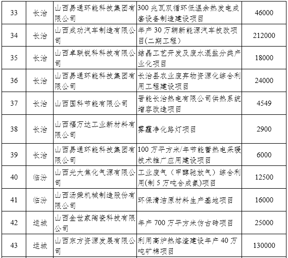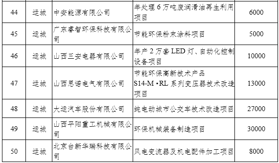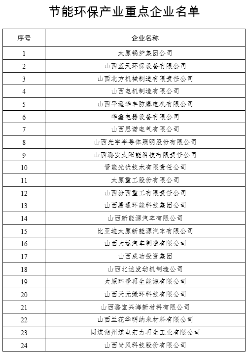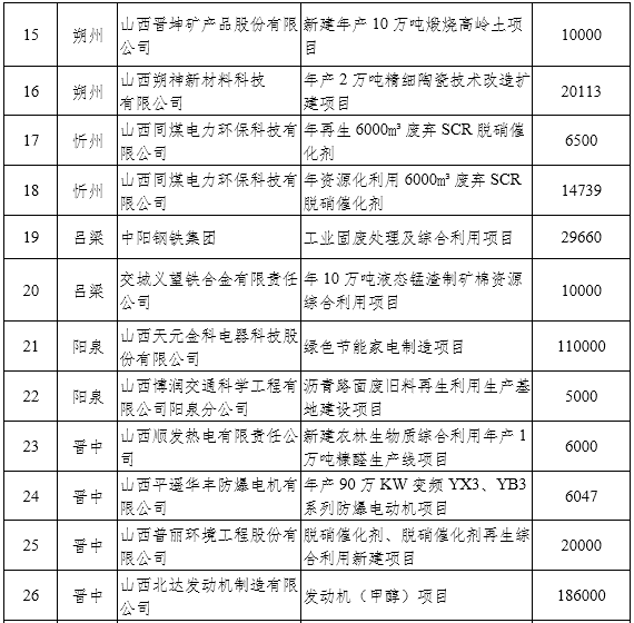 在節(jié)能環(huán)保裝備制造方面,重點(diǎn)推進(jìn)太原重工新能源裝備有限公司風(fēng)力發(fā)電機(jī)組關(guān)鍵零部件智能工廠建設(shè)項目、原鍋爐集團(tuán)有限公司循環(huán)流化床鍋爐超低排放技術(shù)改造、山西平遙華豐防爆電機(jī)有限公司YB3節(jié)能高效電機(jī)二期項目、山西思諾電氣有限公司節(jié)能環(huán)保高新技術(shù)產(chǎn)品S14-M˙RL系列變壓器技術(shù)改造等項目;在節(jié)能技術(shù)推廣方面,重點(diǎn)推進(jìn)山西易通環(huán)能科技集團(tuán)有限公司100萬平方米/年節(jié)能蓄熱電采暖技術(shù)推廣應(yīng)用建設(shè)等項目;在環(huán)保產(chǎn)業(yè)方面,重點(diǎn)推進(jìn)山西福萬達(dá)工業(yè)新材料有限公司霧霾凈化路燈、山西普麗環(huán)境工程股份有限公司脫硝催化劑、脫硝催化劑再生綜合利用等項目;在資源綜合利用方面,重點(diǎn)推進(jìn)山西平朔煤矸石發(fā)電有限責(zé)任公司基于CFB固硫灰升級利用的年產(chǎn)100萬噸陶粒制備工藝等項目;在節(jié)能環(huán)保服務(wù)方面,重點(diǎn)推進(jìn)同煤電力環(huán)??萍加邢薰灸曩Y源化利用6000m3廢棄SCR脫硝催化劑、山西國科節(jié)能有限公司晉能長治熱電有限公司供熱系統(tǒng)增容改造等項目。(3月底前啟動項目申報工作,按照委內(nèi)要求在年內(nèi)完成相關(guān)工作。)
