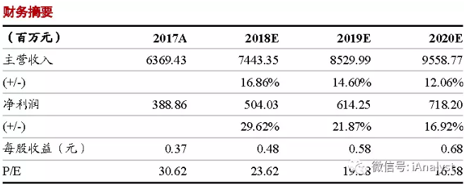 我們預(yù)計,2018-2020年公司將實(shí)現(xiàn)凈利潤5.04、6.14、7.18億元,分別同比增長29.62%、21.87%、16.92%,2017-2019年EPS分別為0.48、0.58、0.68元,對應(yīng)23.6倍、19.4倍、16.6倍P/E。(按2018.4.9收盤價測算。)維持“增持”評級。