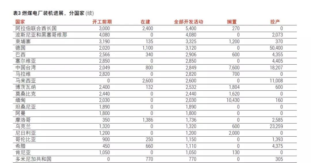 如表3所示,燃煤電廠仍然在60個(gè)國(guó)家內(nèi)積極擴(kuò)張。在這60個(gè)國(guó)家之中,15個(gè)國(guó)家的燃煤電廠項(xiàng)目占據(jù)了90%的新增裝機(jī)容量。本報(bào)告接下來(lái)將對(duì)這些熱點(diǎn)國(guó)家進(jìn)行逐一分析,并對(duì)美國(guó)和歐盟進(jìn)行簡(jiǎn)要闡述。