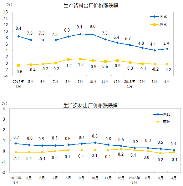 2018年4月份,全國(guó)工業(yè)生產(chǎn)者出廠價(jià)格同比上漲3.4%,環(huán)比下降0.2%。工業(yè)生產(chǎn)者購進(jìn)價(jià)格同比上漲3.7%,環(huán)比下降0.3%。1-4月平均,工業(yè)生產(chǎn)者出廠價(jià)格同比上漲3.6%,工業(yè)生產(chǎn)者購進(jìn)價(jià)格同比上漲4.2%。